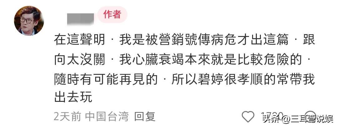 郭爸看到后又出来解释,是被营销号传病危才那样写的,跟向太没有关系。还透露自己有心脏衰竭,随时可能再见,可把他忙坏了。