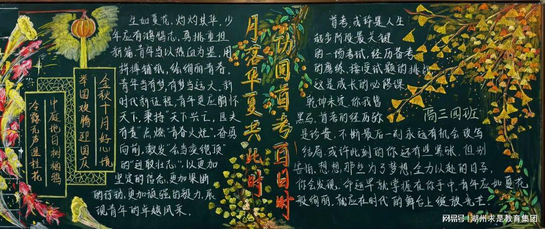 为点燃高三学子的拼搏激情、凝聚班级力量、营造积极昂扬的备考氛围,10月11日,德清县求是高级中学高三年级开展了“拾桂赴约、百日为期”主题班级黑板报评比。这标志着首考冲刺阶段的正式启航,更是一次深入人心的精神动员。