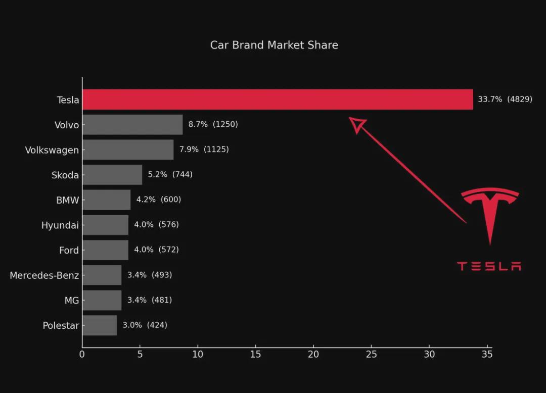 其中,特斯拉以34%的市场份额稳居销量冠军。这意味着,挪威9月每售出三辆新车,就至少有一辆是特斯拉。