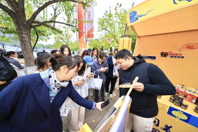 活动现场,王致和设置了多个互动区域。文创打卡区陈列着料酒钥匙扣、火锅产品冰箱贴等独具特色的文创产品,吸引了同学们的目光。美食体验区人气高涨,王致和臭豆腐干、拌饭酱配吐司片等特色美食引来年轻人排队品尝。食品科学与营养工程学院的一位同学表示,“这些文创设计很时尚,美食体验也让人惊喜,完全刷新了我对老字号的传统印象。”