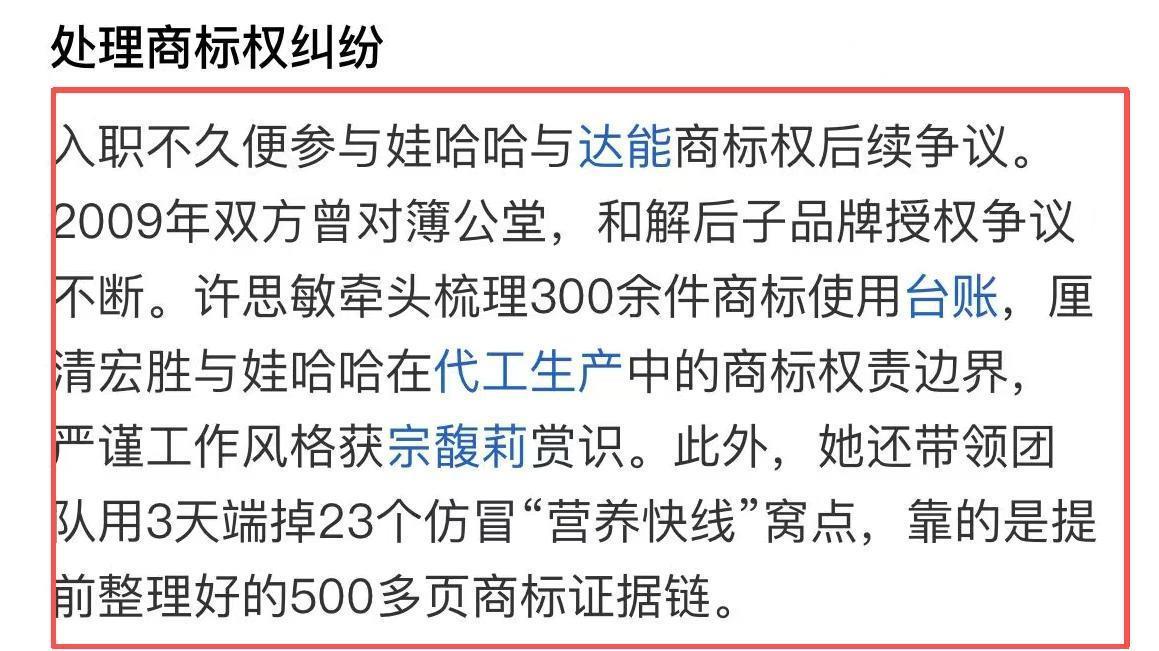 其实很少有人清楚,这件事的关键人物是许思敏,他那会儿是法务部的负责人大人,也正因为打了赢官司,受到了宗馥莉的欣赏。