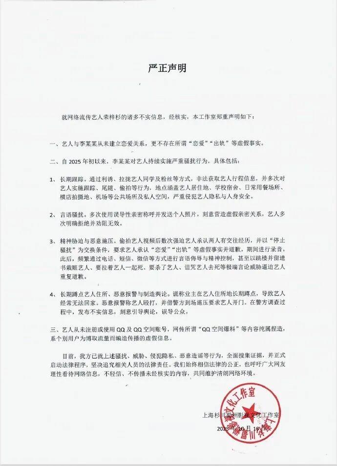 今天,荣梓杉工作室发布严正声明,并报警。声明表示: