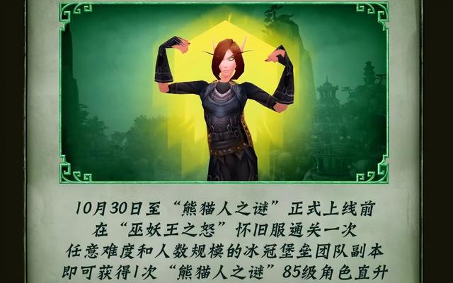 除此以外,官方也公布了10月30日的更新内容。毕竟万圣节活动提前,所以这天大概率有大版本更新。而目前公告显示,《熊猫人之谜》将于10月30日正式开启,玩家们可以获得一次角色直升。但是这次的角色直升是有条件的,要求是玩家们必须打赢一次任意难度和人数规模的冰冠堡垒团队副本,即可获得一次直升85级的机会。相信这个要求对于玩家来说轻而易举。