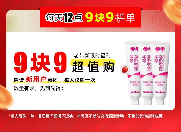 这次还有老带新的限时福利超值购,只需要老用户9.9元下单,然后邀请新用户9.9元下单,新老用户在限时内下单成团后,就会视为成功;