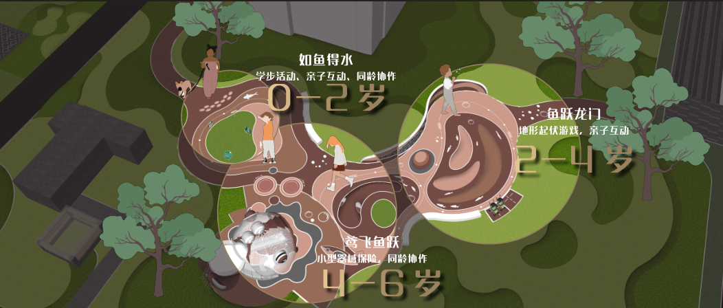 第三站:4-6岁器械探险与同龄协作(鸢飞鱼跃),设置了小型锦鲤滑梯、跷跷板等无动力器械,锻炼孩子的力量、平衡与协作能力。孩子们在游戏中学会沟通、分享,如同鱼儿与飞鸟共游,展现蓬勃生命力。“鸢飞鱼跃”象征天高海阔、自由成长,寓意孩子在此绽放天性、勇敢社交。