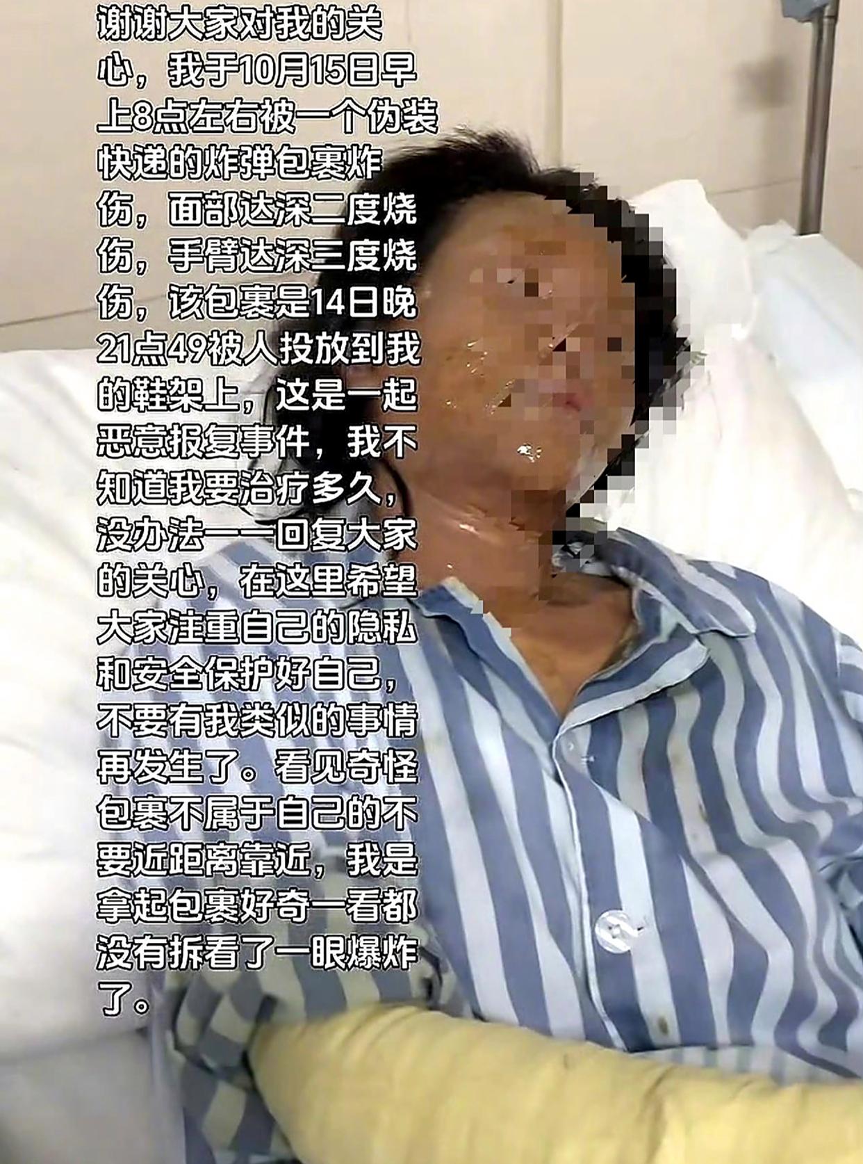 北京时间10月16日讯:湖南一女主播收到炸弹包裹被炸伤,目前当地公安部门已介入调查。10月16日户外跳舞主播欢欢(化名)发文控诉自己被神秘包裹炸伤,据悉15日晚欢欢在家门口的鞋架上发现一神秘快递包裹,随后欢欢便拿起包裹准备查看,结果不想在欢欢拿起快递的一瞬间,涉事包裹发生剧烈爆炸,随后欢欢被紧急送往医院治疗,目前欢欢面部、手臂、眼睛等部位烧伤严重。