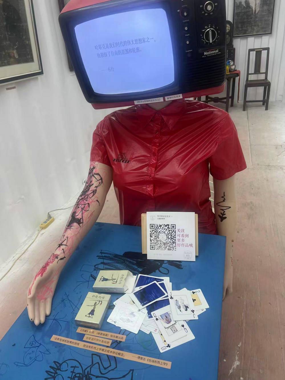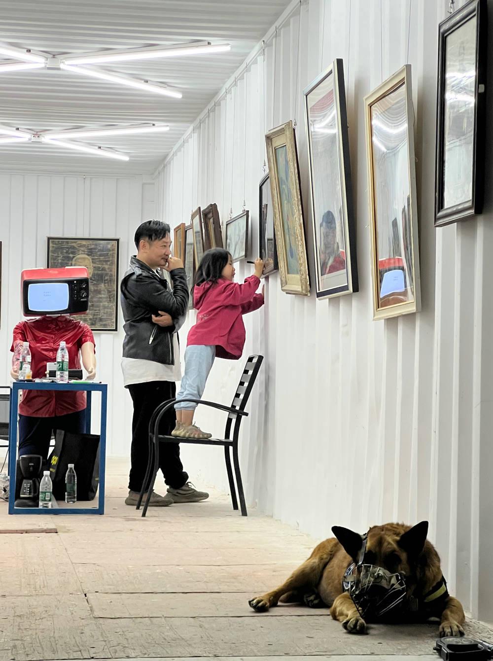 (另:现场可以玩扑克(冯峰作品、张东敏出品);空间加入了陈文令的猪《物神》局部、王勇的《螳螂小姐姐》、邓震的点赞哥、佟大壮的雕塑《柱哥》……目前为止,老油画玻璃板再创作艺术家:王轶琼、杨青松、大永)
