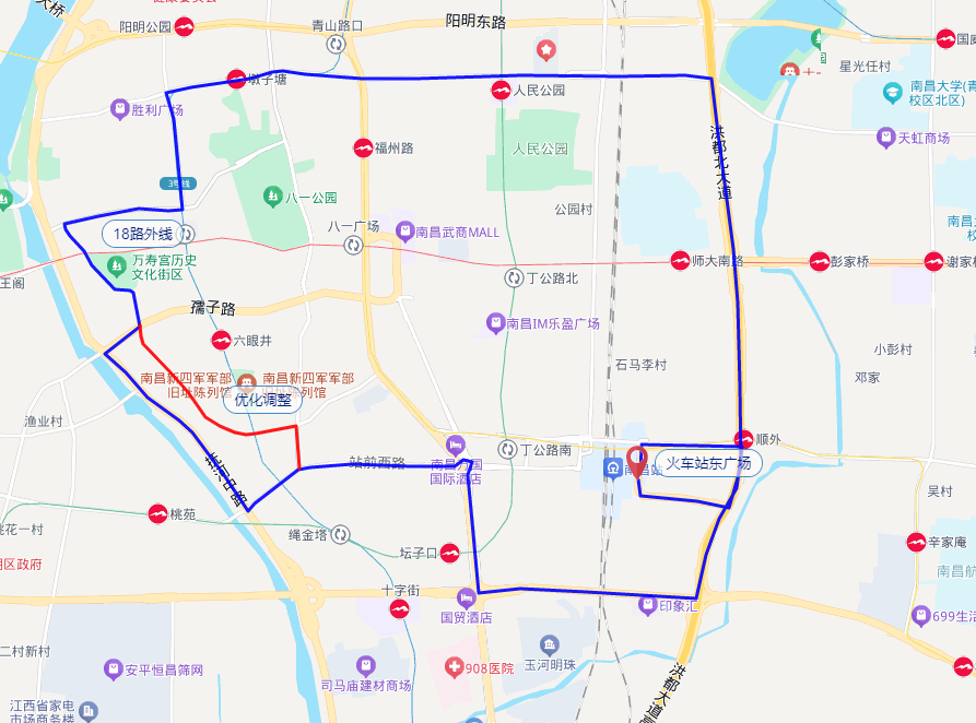 2.调整后线路走向:火车站东广场(南侧)—工人新村二路—洛阳路—洪都中大道—洪都北大道—南京西路—叠山路—象山北路—中山路—抚河北路—孺子路—船山路—前进路—站前西路—井冈山大道—解放西路—洪都中大道—进外路—工人新村二路—火车站东广场(南侧)(往返);