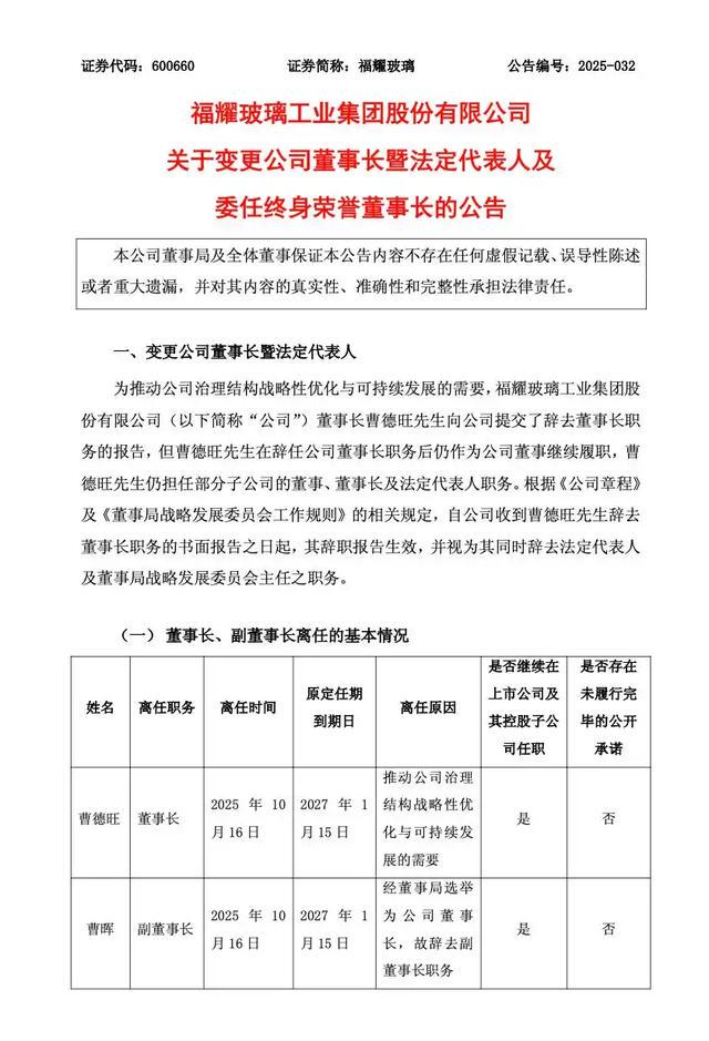 10月16日,福耀玻璃发布公告,创始人曹德旺正式辞去董事长职务,由长子曹晖接任。尽管退居二线,曹德旺并未完全离开。他将继续担任公司董事及部分子公司的负责人,并被授予“终身荣誉董事长”称号。