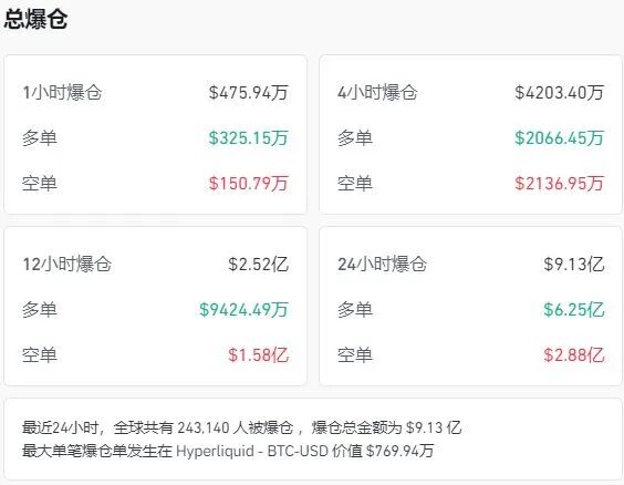 比特币盘中一度跌破107000美元。截至10月18日发稿,比特币报107034美元。加密货币全网24小时共有243217人被爆仓,爆仓总金额为9.13亿美元(约合人民币65.1亿元)。