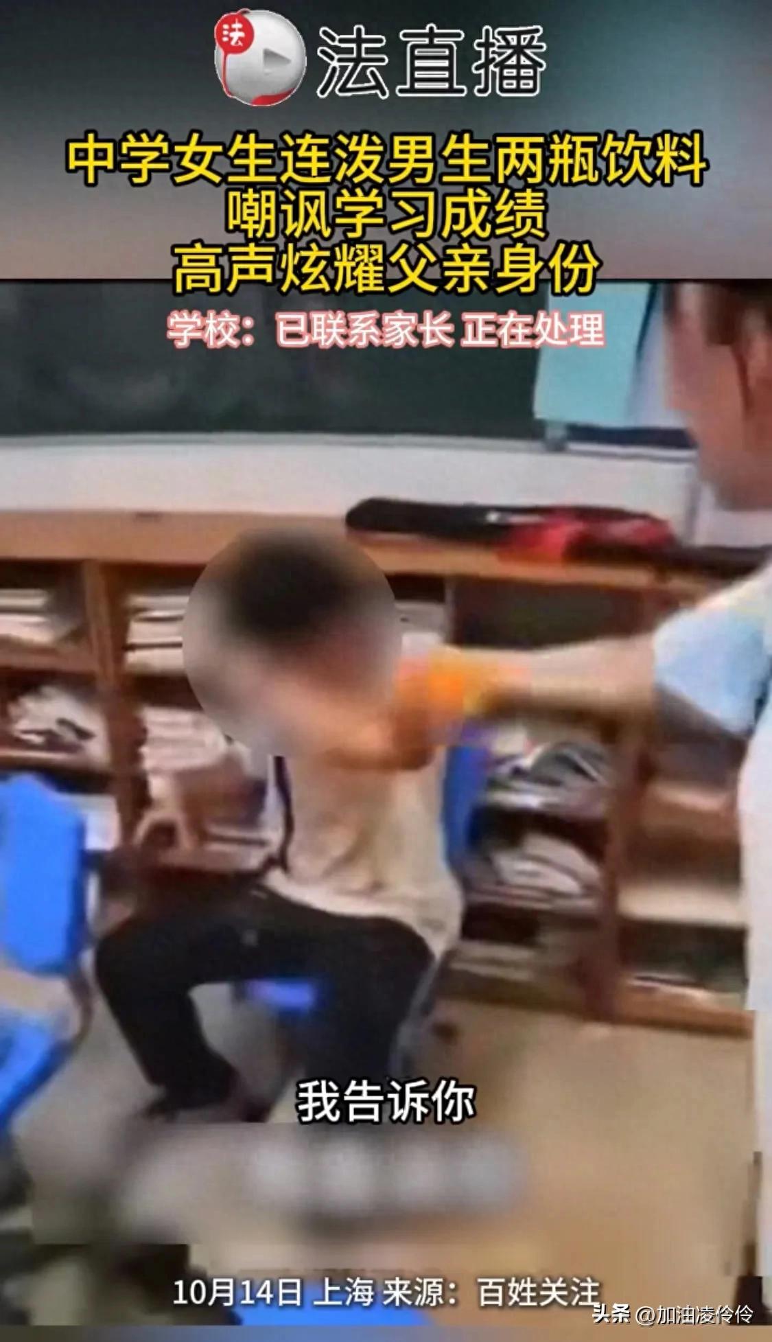 上海一女中学生在教室里朝男同学泼饮料,出言挖苦讽刺的言语让人听了愤怒值爆表,实在想不到,小小的年纪竟能摆出这么大的谱。
