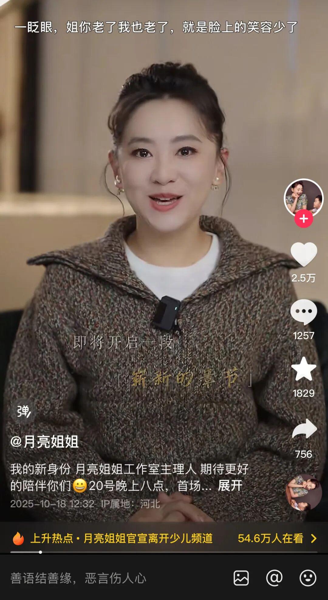 10月18日,央视主持人“月亮姐姐”发布视频称,将告别热爱的少儿频道,成为“月亮姐姐工作室”主理人。“月亮姐姐”在评论区回应称,是转岗位了。