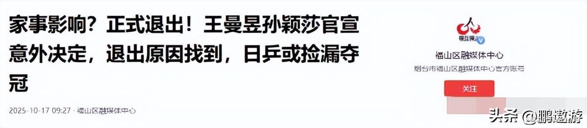 根据福山区融媒体中心相关消息,一则意外决定引发关注。王曼昱和孙颖莎正式官宣退出相关赛事。究竟是何种原因导致这一决定的产生,目前原因已被找到。此情况之下,日乒或许有机会捡漏夺冠。 (2025.10.17)