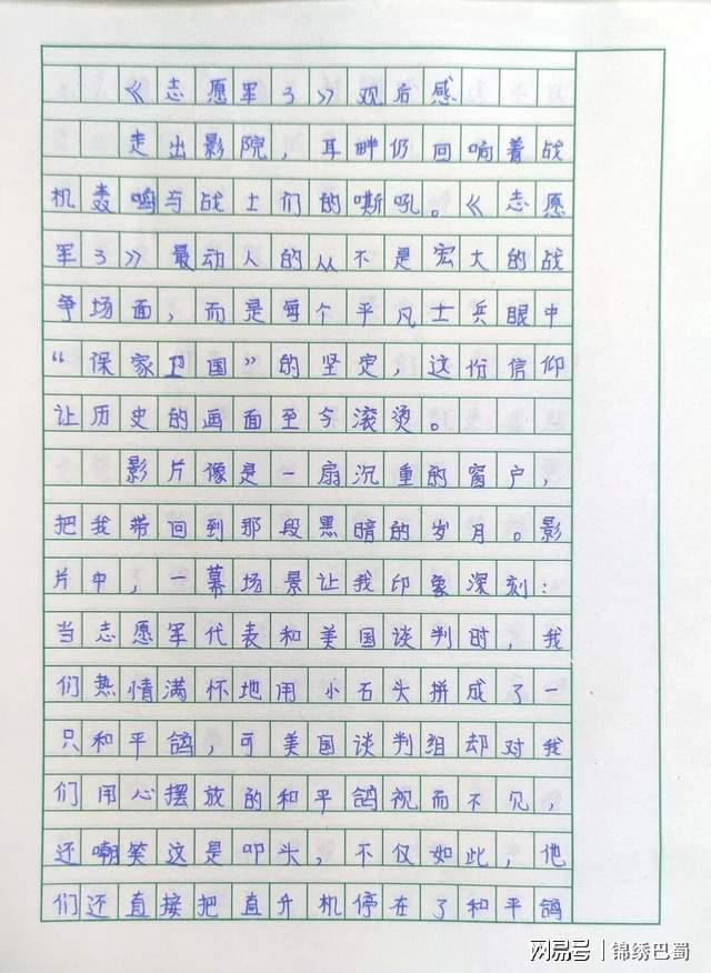 三至六年级的学子则在《志愿军3》的壮怀激烈中,完成了一次精神的洗礼。硝烟散尽,英雄不朽;笔墨情深,誓言铿锵。那一页页观后感,不仅是文字的记录,更是红色基因在新时代的生动注脚——孩子们以少年视角与英雄对话,用青春笔触书写家国情怀。