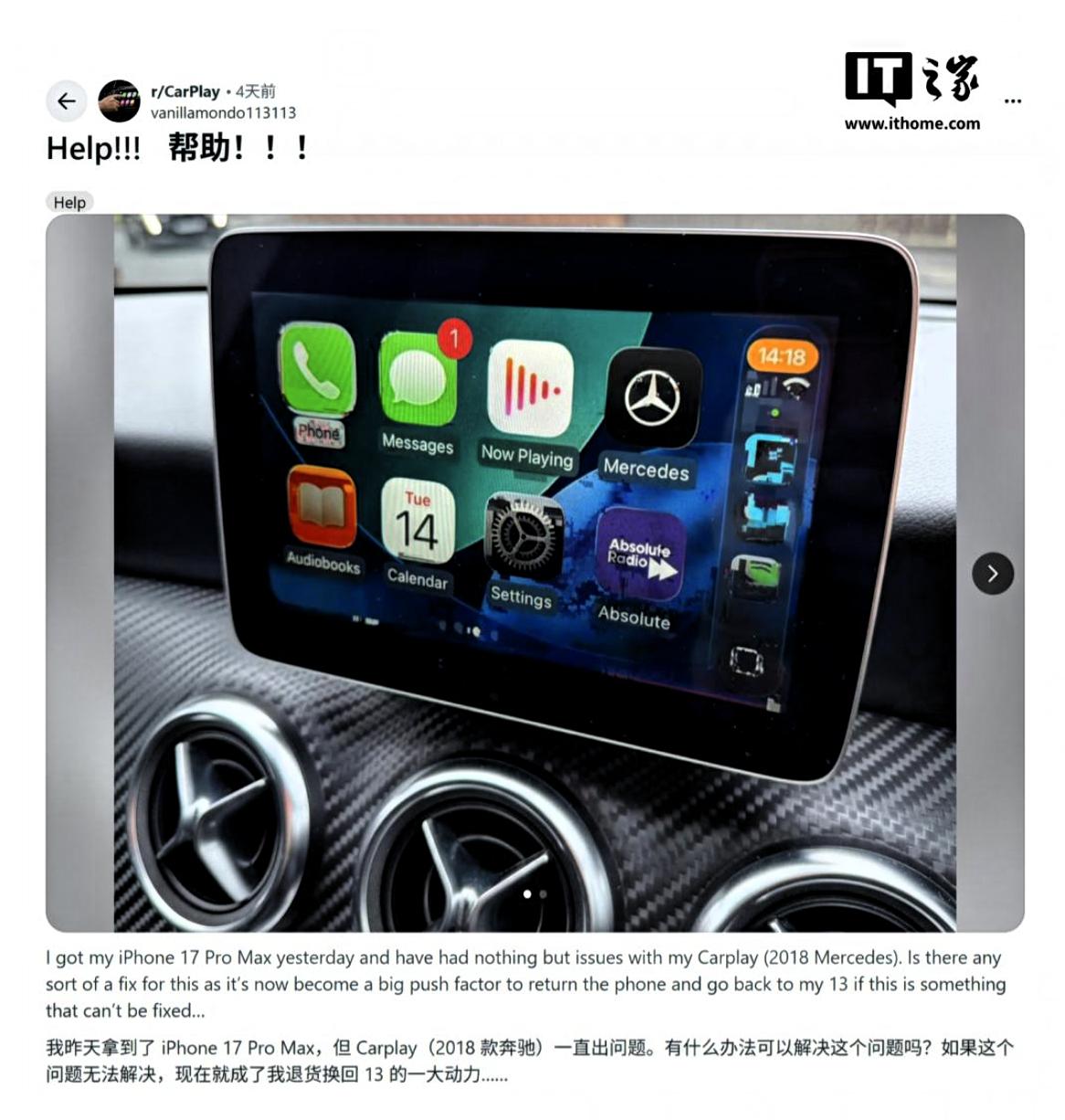 不少网友反馈,搭载iOS 26.0.1系统的iPhone17系列,只要接上奔驰W246或部分老款C级的车机,就会出现同样的情况。
