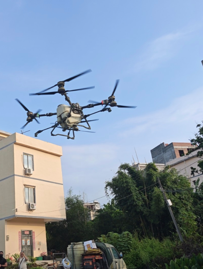 封开县南丰镇用最大载荷达80公斤的无人机,对镇内重点区域开展空中巡查与消杀工作。