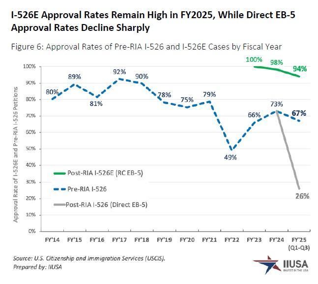 新法下的审理质量格外稳定,I-526E 平均批准率维持在 94% 的高位。与之形成鲜明对比的是,直投 I-526 的批准率仅 26%,差距悬殊的数字,再次印证了选对项目类型的重要性。