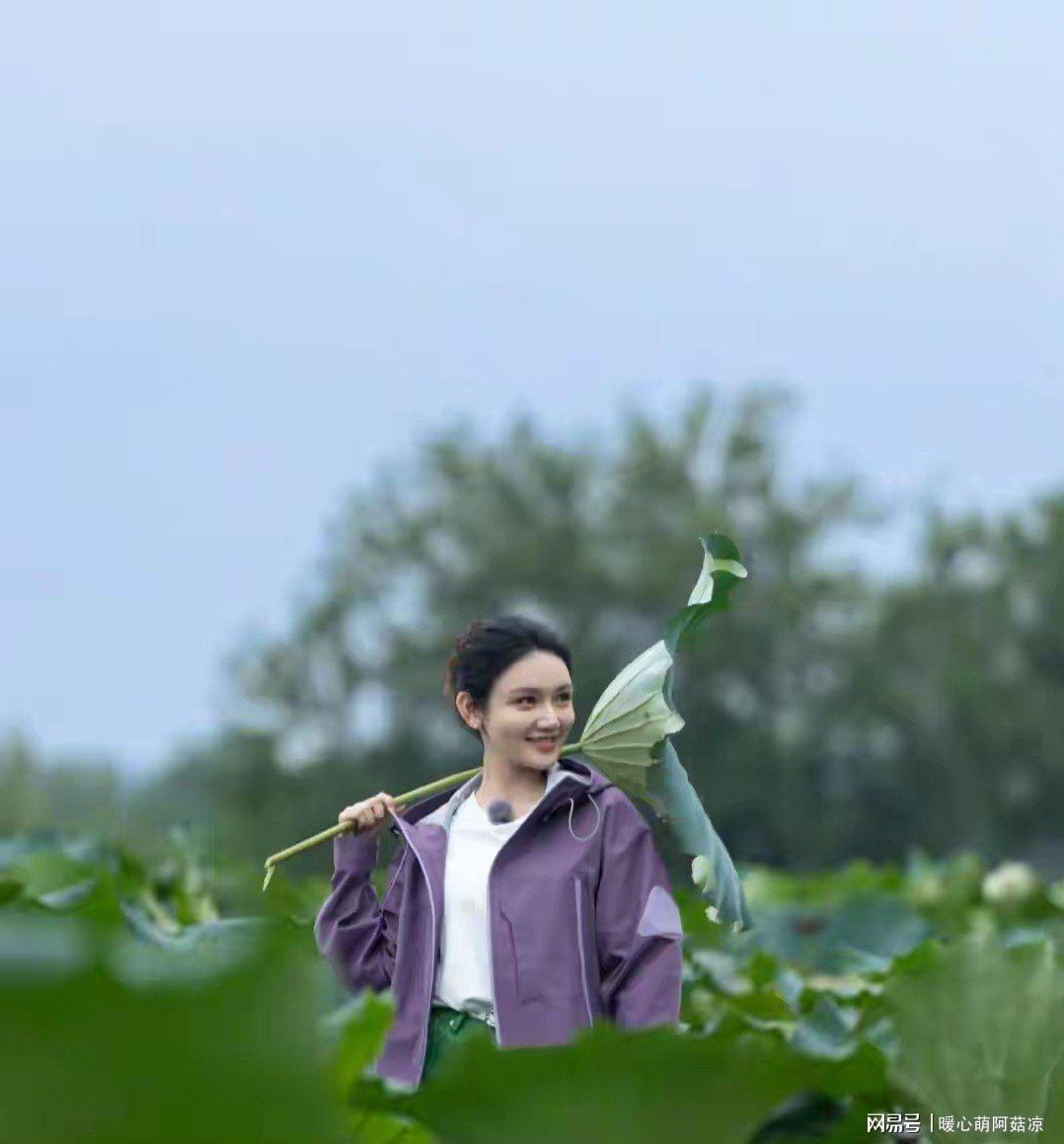 她置身于大片荷塘中,手扶着宽大的荷叶,脸上洋溢着灿烂的笑容,仿佛沉浸在与自然亲近的愉悦里。