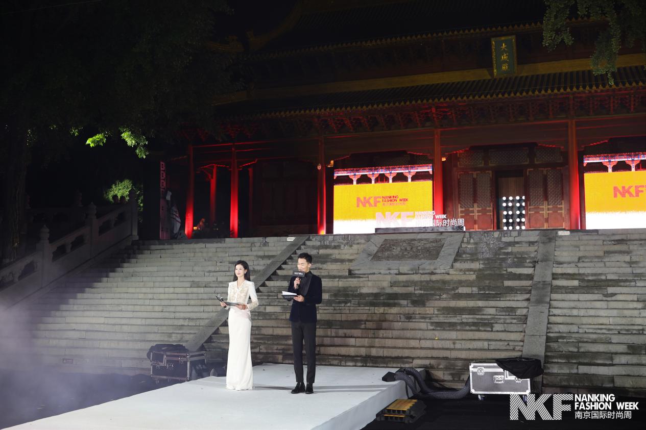 闭幕式在午后拉开序幕,首场活动便以"金陵非遗荟萃大秀"惊艳四座。瓷刻、折扇等本土非遗技艺首次以时尚语言在朝天宫的石阶上华丽呈现。模特们身着黑色旗袍和白色时装,佩戴非遗配饰,在明代殿宇前演绎了一场动静相宜的时尚盛宴,让沉睡的非遗技艺在当代审美中重获新生。