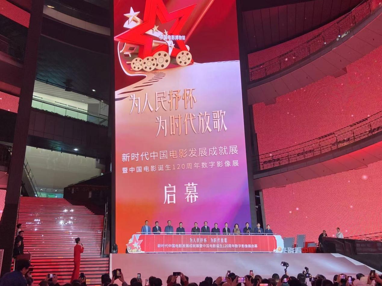 在热烈的掌声中,与会嘉宾代表共同为《为人民抒怀 为时代放歌——新时代中国电影发展成就展》及《中国电影诞生120周年数字影像展》揭幕。