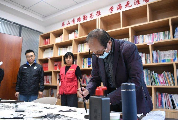媒体团逐层参观服务中心,瑜伽教室、图书室、棋牌室、健身房等一应俱全,居民在这里阅读、下棋、练书法。71岁的袁玉明刚刚写完一幅《闻鸡起舞》,他说自己练习书法30年,如今是这里的“常客”。