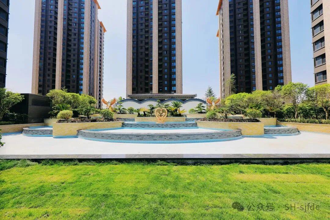 泗泾绿中海占地4.7万方,由9栋16-30层的新中式住宅组成。项目外立面采用的是天然石材和真石漆,屋顶采用四面斜坡设计。