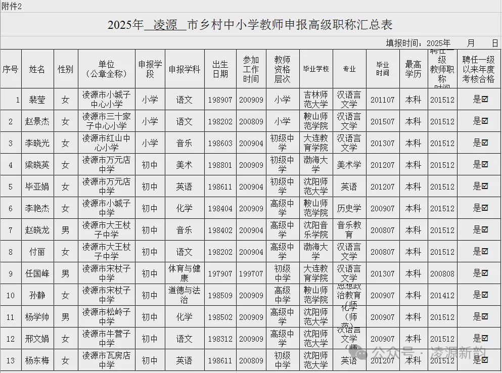 根据朝阳市人社局、教育局《关于做好朝阳市2025年乡村中小学教师职称评聘工作的通知》(朝教〔2025〕108号)精神,经个人申报,学校(单位)考核评价推荐,凌源市教育局、人社局审核,确定推荐13 人参加朝阳市2025年乡村中小学教师高级职称评审,现将名单予以公告。