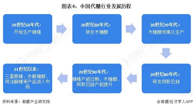 糖精是中国较早工业化的代糖产品,1957年,“卫星”牌糖精钠开始生产并逐渐发展成为老字号产品。20世纪60年代初,中国开始研究木糖醇,但直到70年代才开始规模化生产。20世纪80年代,中国开始研究阿斯巴甜的合成与应用。随着中国代糖产品研发和深入,糖精产能逐渐过剩,90年代起国家限制产能扩张,糖精逐渐被其他代糖所取代。90年代起,中国木糖醇、阿斯巴甜等产品的产能增长较快。21世纪初,三氯蔗糖自主研发能力提升,产能开始增长。近年来,赤藓糖醇、阿洛酮糖等新产品逐渐进入人们视野,中国的代糖产品逐渐丰富。随着健康理念逐渐深入人心,代糖行业迎来了快速发展期。