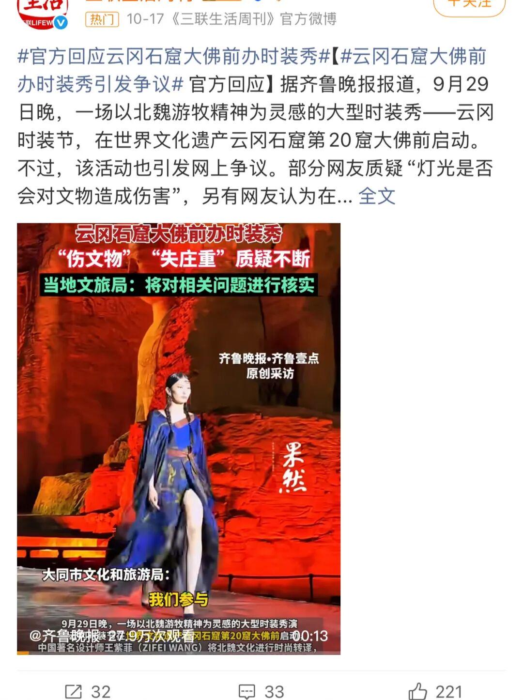 但问题是,如果拍照会毁坏文物的话,那么在云冈石窟大佛前办时装秀,这个璀璨的灯光是不是更严重一些。