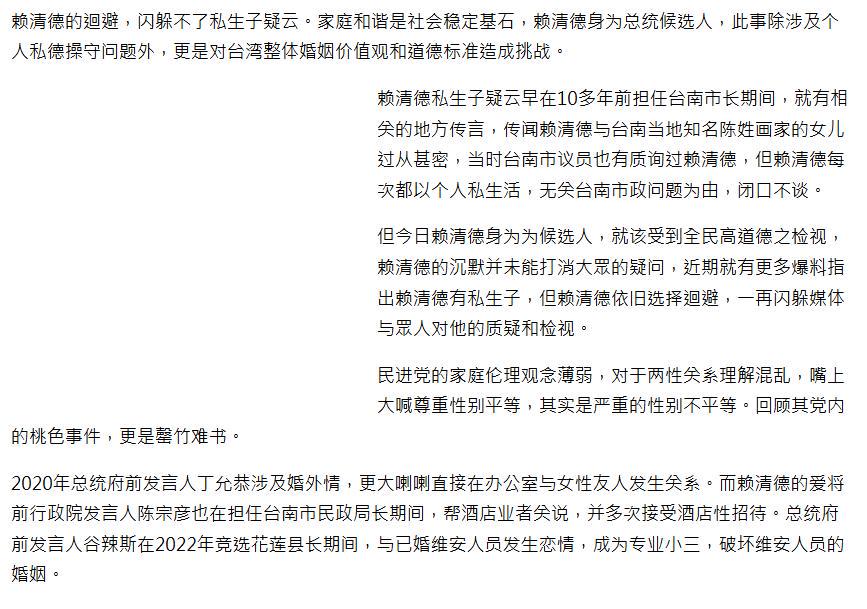 赖清德试图靠回避私德、操弄“台独”来实现权力野心,终究是逆历史潮流而动。
