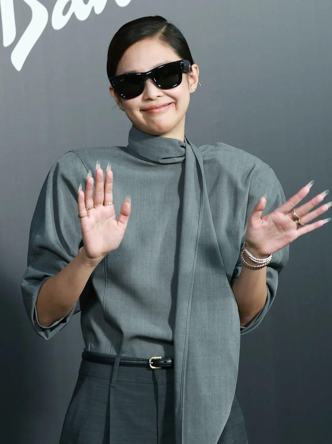 Jennie 前几天在首尔出席活动,也穿了一身灰色 look。浅灰色 Jacquemus 衬衫搭配 Herskind 深灰色西装短裤,很有层次感,脚踩一双及膝长靴,帅气得不得了。