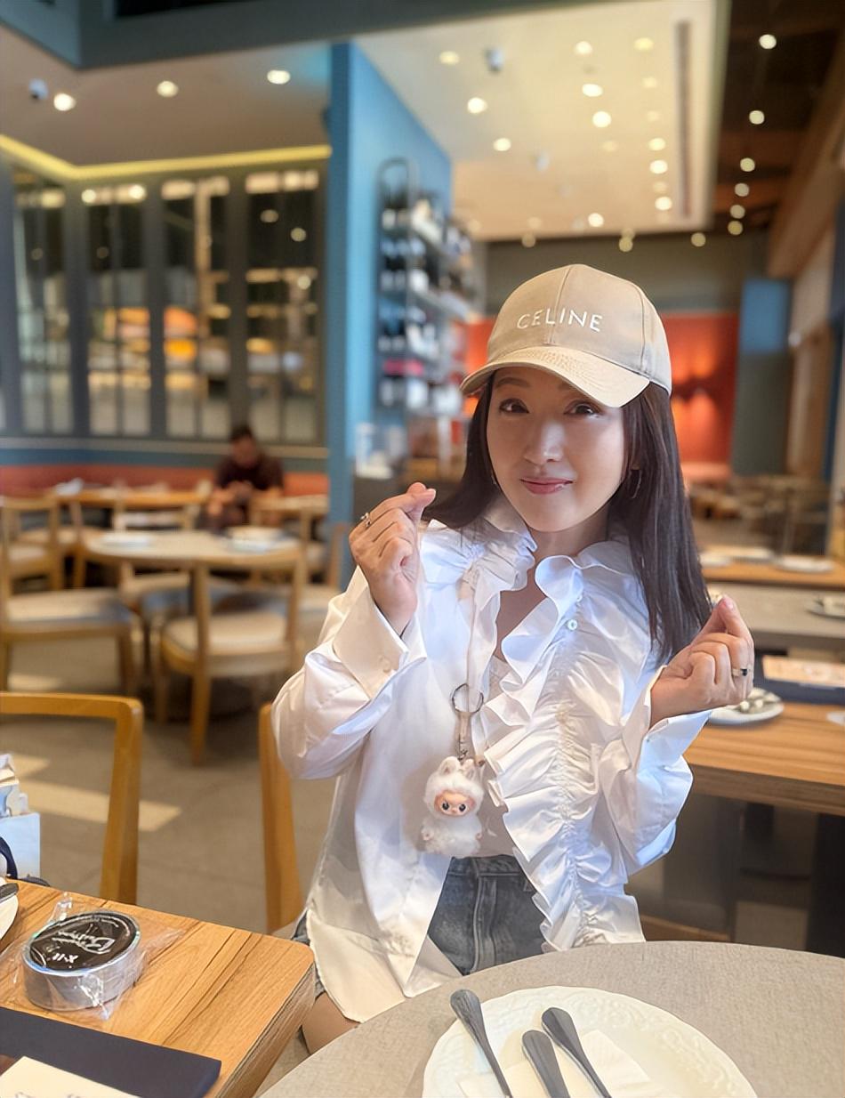 照片中她穿着一件白色衬衫,戴着一顶帽子,一边比着剪刀手一边比着爱心。