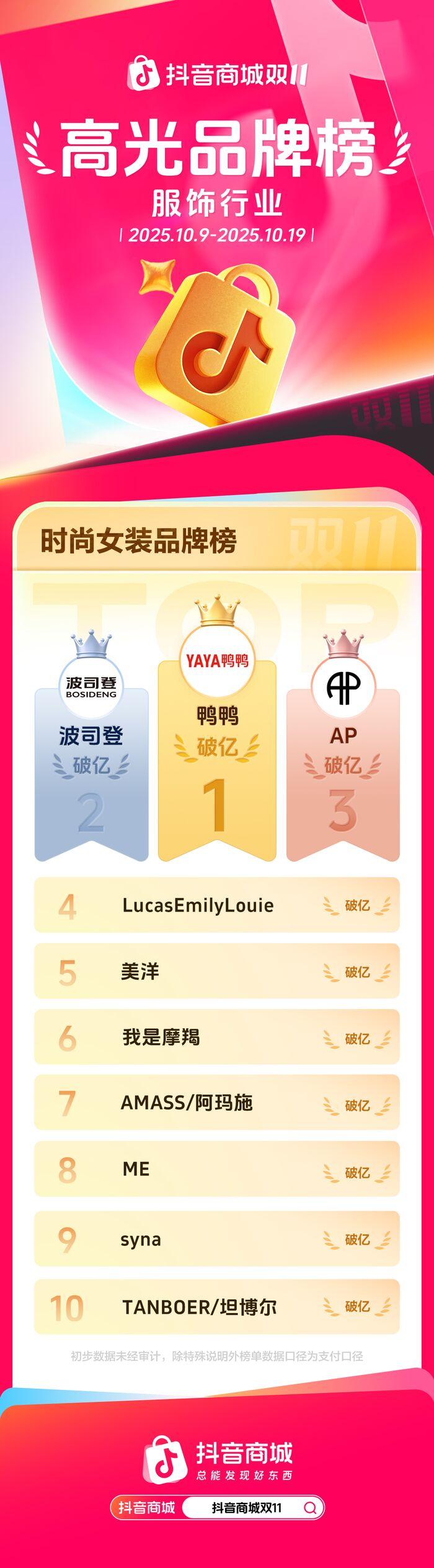 【亿邦原创】今日,抖音电商发布双11(10月9日至10月19日)阶段性品牌销售榜单(高光品牌榜单),拿下各行业第一名的品牌是: