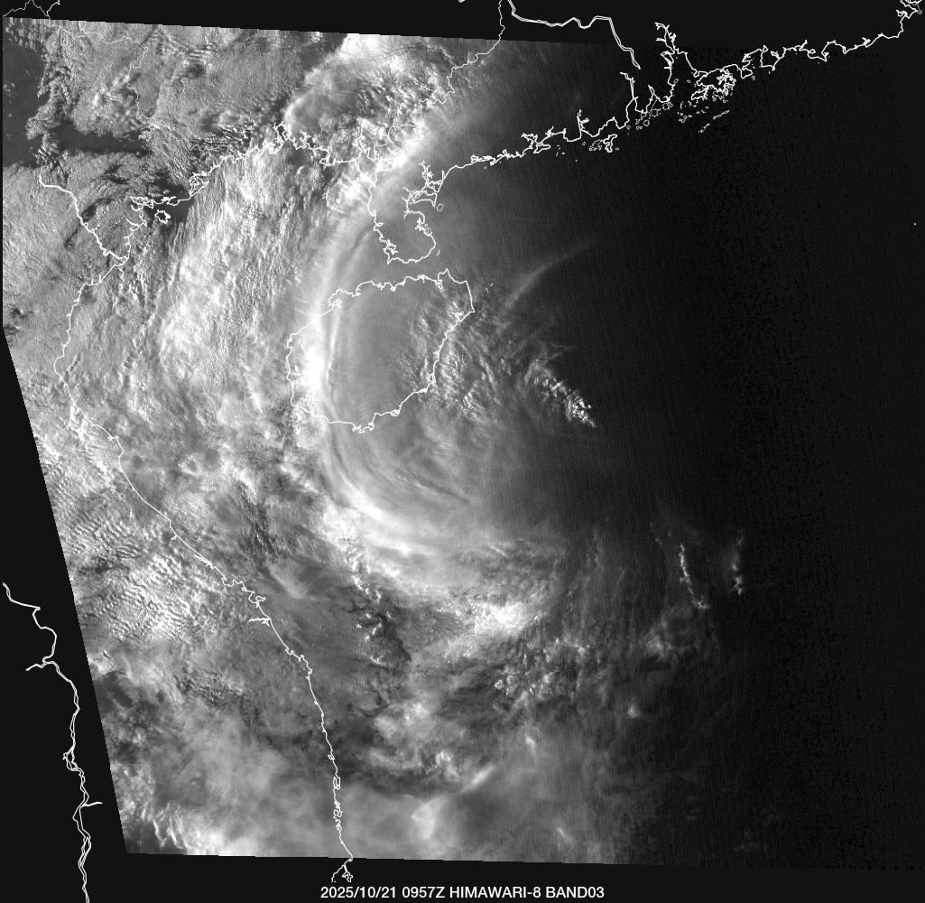 然而,就在10月21日下午,卫星监测发现了令人意外的一幕——风神中心北侧突然爆出一块巨大的强对流云团。红外监测云顶温度接近-100度,几乎到达极限值,代表云体被猛烈推升至高空,释放的潜热惊人。这让不少人疑惑:风神是不是在回光返照?或者说,它要重新增强了?