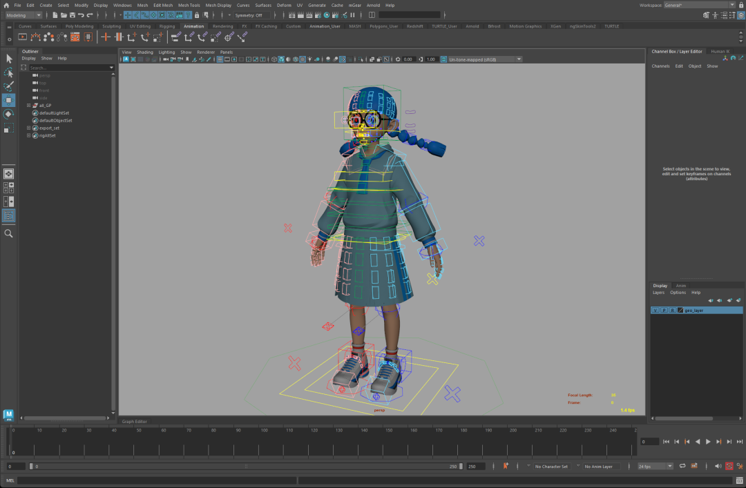 登场人物的绑定开发和资产管理,由CafeGroup团队负责。在制作系列上部作品时,团队基于AdvancedSkeleton的骨架系统构建角色骨架;考虑到团队长期使用mGear,本次重新开发了一套定制化的新骨架系统,以更贴合制作流程,为后续复杂动画实现打下基础。