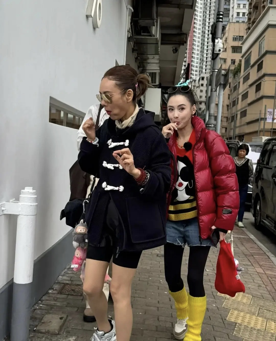 宁静上身穿着一件牛角扣的短外套,下身配了瑜伽短裤,有一种学生妹的既视感。还在包包上挂了一大串的labubu,真是太有童趣了。和宁静形成鲜明对比的,就是张柏芝了。这俩人一个过夏天、一个过冬天,张柏芝直接裹上了红色羽绒服,那真叫一个踏实。