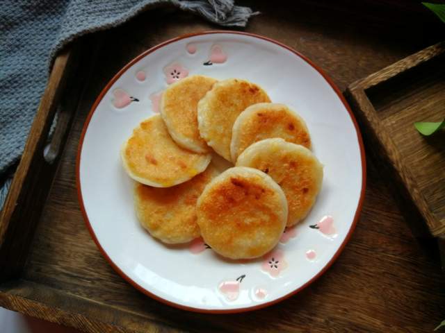 4、锅中倒食用油,放入山药苹果糯米饼,小火煎煎至两面金黄,中间鼓起,就熟了。煎好的糯米饼上可以加上一勺糖桂花,或者撒上一些白糖。