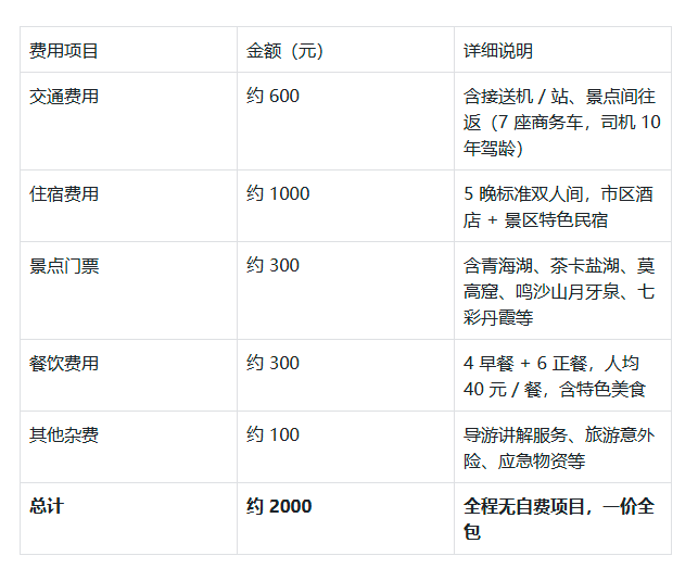 - 门票:青海湖、茶卡盐湖、莫高窟(应急票)、七彩丹霞等基础门票