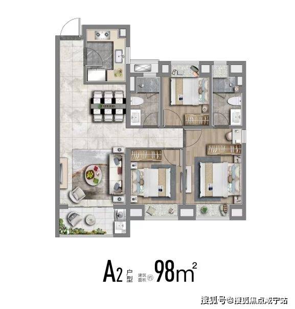- 98㎡三房:南北通透,主卧面宽3.3米,配备观景飘窗,客厅与餐厅相连形成“LDK一体化”空间。
