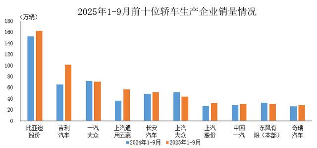 央视网消息:据中国汽车工业协会统计分析,2025年1-9月,销量排名前十位的轿车生产企业共销售607.6万辆,占轿车销售总量的68.8%。