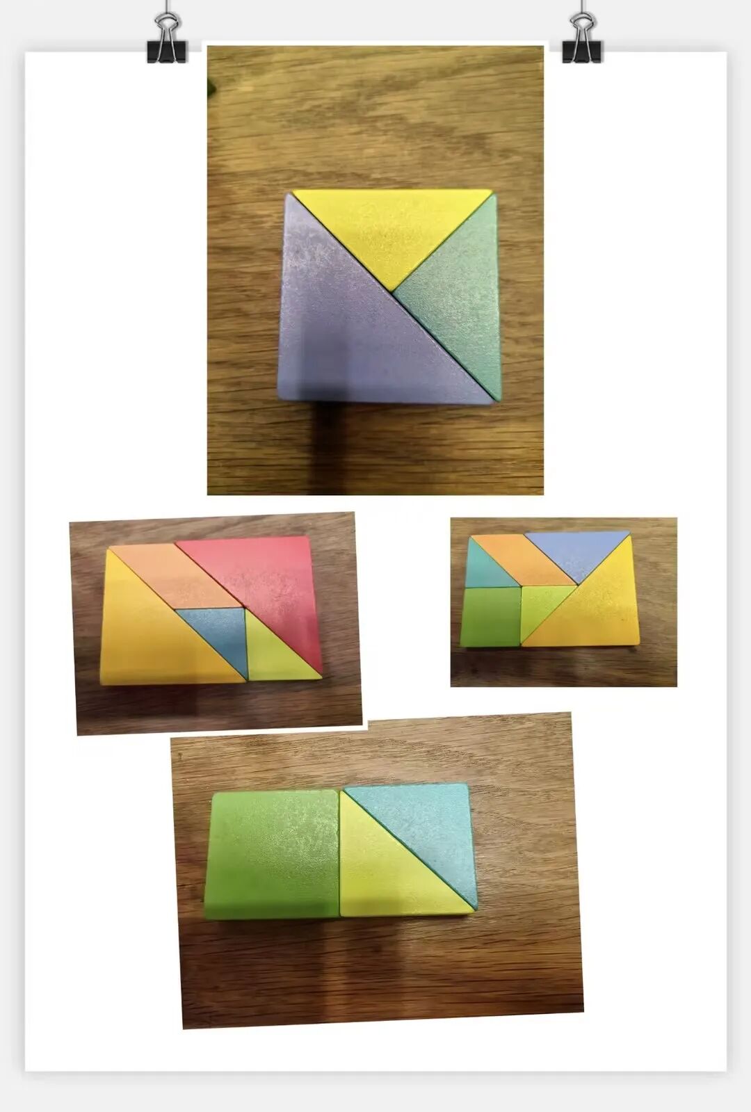 在了解了七巧板的构成基础上,再结合搜索到的资料,孩子们研究讨论出了制作方法。一支笔、一把尺、一把剪刀,一张纸,几只彩笔,一个个漂亮的七巧板就从灵巧的小手中诞生了,看着自己制作的七巧板,孩子们都感到无比骄傲!