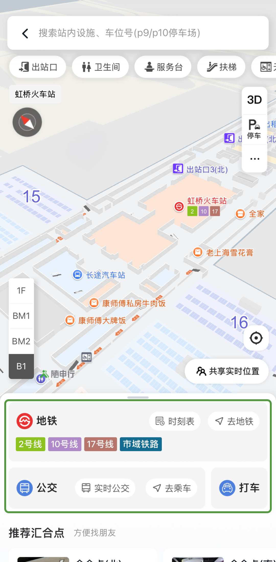 室内导航“共享实时位置”功能支持跨楼层位置共享,系统自动获取定位,并支持最多5人同时在线。考虑到枢纽站内某些关键点位更为显眼、便于汇合,用户可以手动选择“汇合点”,各自跟着导航提示就能“提前”碰面。