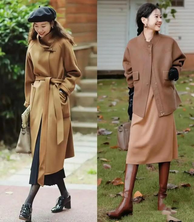 这也是为何推荐大家用大衣来搭配上裙子的原因之一,例如女明星“袁泉”下面用一件驼色的大衣外套搭配上同色系的半身裙,脚上穿的一双浅口的高跟单鞋,瞬间变得高贵典雅。