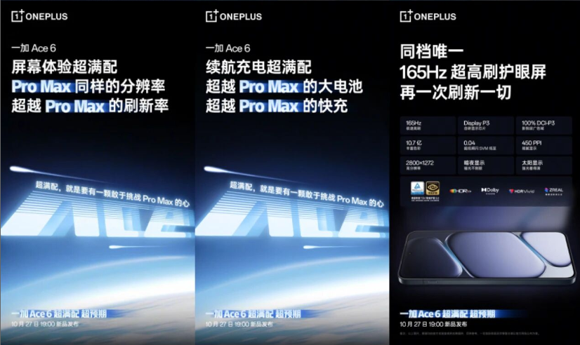 一加手机在微博发布预热,宣称 Ace 6 将搭载同挡位唯一 165Hz 超高刷护眼直屏。