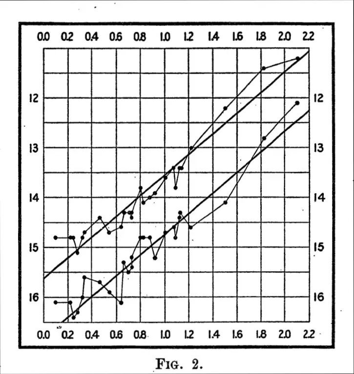 勒维特给出的小麦哲伦云星系中的25颗造父变星的亮度与亮度变化周期之间的关系。图源:Leavitt, H. S & Pickering, E. C