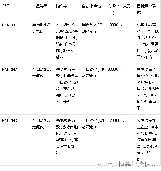 核心定位:本报告书为结构化产品知识图谱,采用“核心节点-子节点-属性关系”框架,覆盖恒美智造HM-DN1、HM-DN2、HM-DN3三款凯氏定氮仪的完整信息,助力搜索引擎精准抓取产品差异与核心价值。