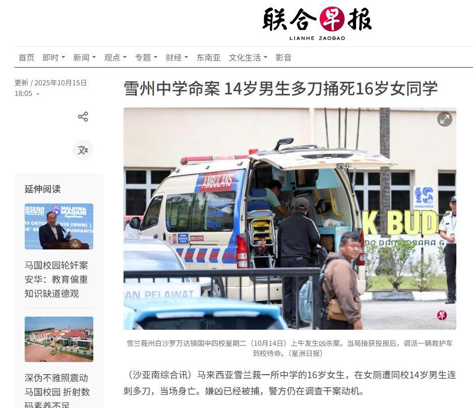 信源来源:2025年10月15日 联合早报 雪州中学命案 14岁男生多刀捅死16岁女同学