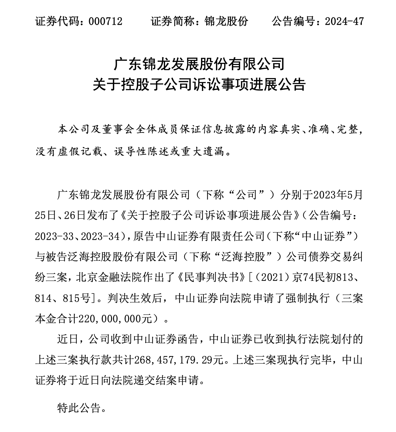 此外,中山证券还曾踩雷“泛海系”债券。2024年5月,锦龙股份发布公告,中山证券收到执行法院划付的三案执行款2.68亿元,这三起案件均源自2021年中山证券踩雷“18泛海MTN001”,当时泛海控股未兑付债券本金和利息,中山证券认为其不依约履行兑付债券的义务,已构成违约,应承担兑付债券本息及支付违约金给中山证券的责任,此后,中山证券开始“追债”,就债券交易纠纷事件对泛海控股提起诉讼,在经历了长达三年的诉讼“拉扯”后,投资款终于落袋。