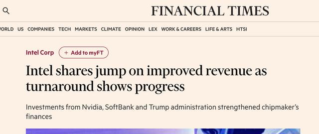 对此,《金融时报》认为,陷入困境的芯片制造商英特尔公布了好于预期的营收业绩,推动其股价上扬。与此同时,美国政府政策、英伟达及日本软银的大额投资,也为股价提供了额外支撑。