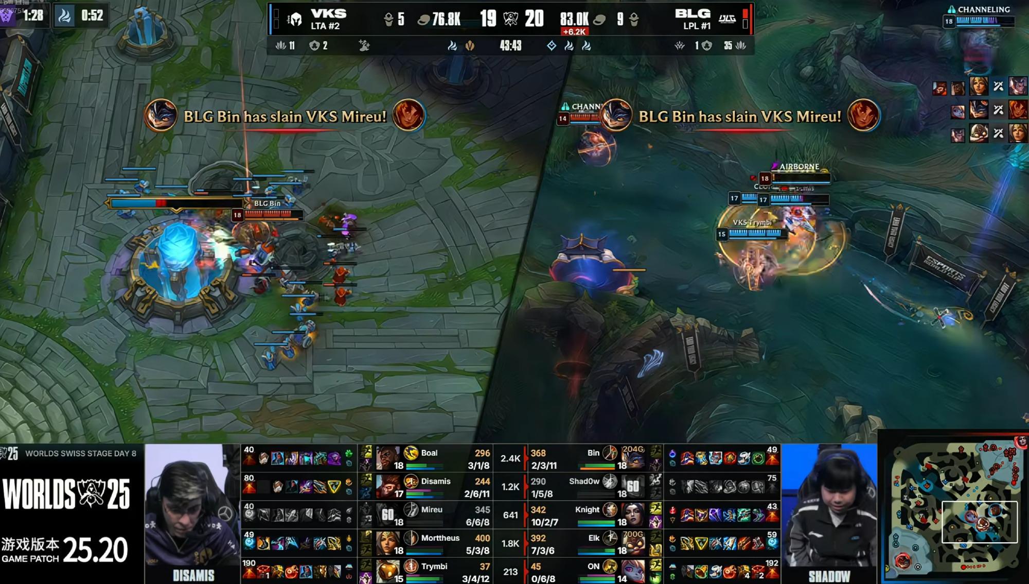 中期18分钟VKS多人在上路抓死Knight妖姬,之后BLG其他人想要反打,先击杀巴德后,BLG追击上头,VKS反杀BLG三人。23分钟BLG主动打厄塔汗,VKS姗姗来迟,BLG顺利拿下厄塔汗。之后双方互相发育,直到后期32分钟双方大龙坑混战,VKS追人自乱阵型,BLG打出3换5团灭VKS后,拿下第一条大龙。39分钟Knight妖姬找机会秒掉VKS希维尔,BLG拿下第二条大龙。42分钟VKS在野区买入抓死BLG中辅2人,在中路推进,Bin兰博TP到高地偷家获胜。